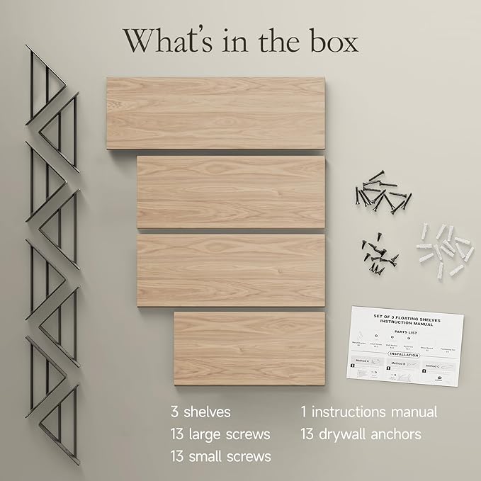 - **Three different size Floating Shelves for All** : Large: 16.5 Ã 5.5 Ã 4.6 inches; Medium: 14.2 Ã 5.5 Ã 4.6 inches; Small: 11.4 Ã 5.5 Ã 4.6 inches. These floating shelves are wider and sturdier than others to safely hold collectibles, photos, small plants and showcase favorite dishes or build your own coffee bar. Easy to assemble with all necessary hardware included according to the instruction steps.