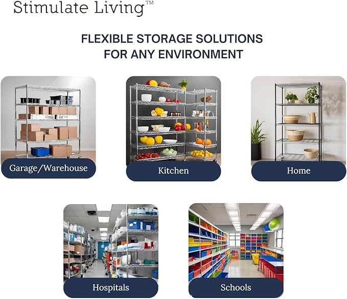 - ★FLEXIBLE USAGE★ Our Stimulate Living Wire Shelving is designed to be flexible and adaptable to a wide range of settings. It can be used in warehouses to store heavy equipment, in kitchens to hold cooking utensils, in garages to organize tools, in hospitals and laboratories to store medical supplies, in offices to keep files and documents, in retail stores to display merchandise, in restaurants to store kitchenware, in factories to hold raw materials, and more.