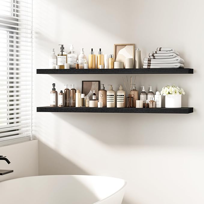 - Versatile & Multi-Scene Functionality: Our floating shelves are available in a variety of sizes and thicknesses, allowing you to choose the perfect fit for your space. Use them in the bathroom to store beauty products, hair care items. In the bedroom, they can hold books, cosmetics, and personal items. In the kitchen, theyâre perfect for spices, jars, or small utensils. Or display photo frames, trophies, or collections in the living room. These shelves efficiently use wall space to create a tidier, more spacious feel in any room.