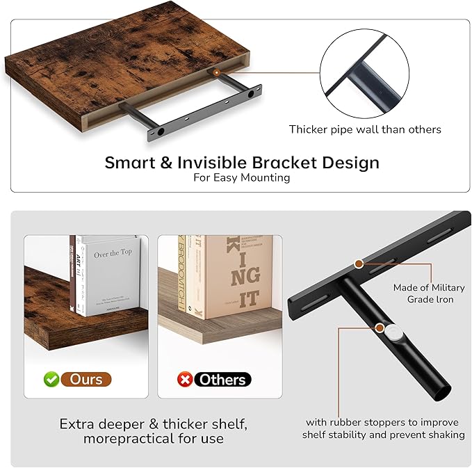 - Rustic & Modern Wooden Floating Shelves: Crafted from durable engineered wood with a realistic wood grain finish, our floating shelves offer the perfect blend of rustic charm and modern minimalism. The matte surface enhances its sleek, contemporary look, making it ideal for any room in your home. Whether you want to display your collection or organize essentials, these wall shelves seamlessly integrate with any dÃĐcor and can be mounted on any wall to elevate your living space.