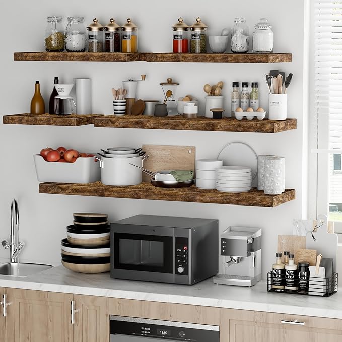 - Versatile & Multi-Scene Functionality: Our floating shelves are available in a variety of sizes and thicknesses, allowing you to choose the perfect fit for your space. Use them in the bathroom to store beauty products, hair care items. In the bedroom, they can hold books, cosmetics, and personal items. In the kitchen, theyâre perfect for spices, jars, or small utensils. Or display photo frames, trophies, or collections in the living room. These shelves efficiently use wall space to create a tidier, more spacious feel in any room.