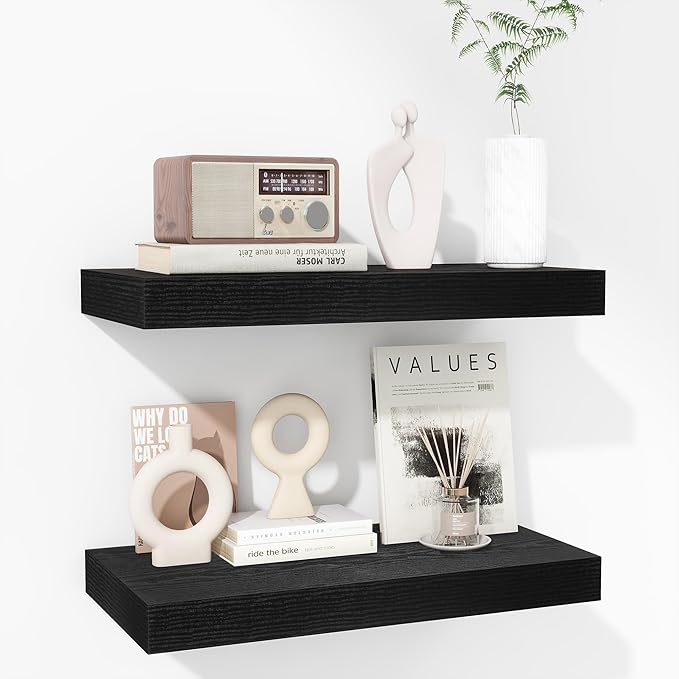- Versatile & Multi-Scene Functionality: Our floating shelves are available in a variety of sizes and thicknesses, allowing you to choose the perfect fit for your space. Use them in the bathroom to store beauty products, hair care items. In the bedroom, they can hold books, cosmetics, and personal items. In the kitchen, theyâre perfect for spices, jars, or small utensils. Or display photo frames, trophies, or collections in the living room. These shelves efficiently use wall space to create a tidier, more spacious feel in any room.