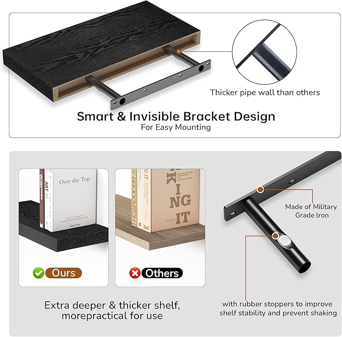 - Extra Deeper & Thicker - Each board measures 16"W x 8"D x 1.5"H. Extra deeper and thicker design in order to bring maximizes storage space and weight capacity, even hold up to 30 lb each. This floating shelf taking up zero square feet, reduces clutter and highlights dÃĐcor in compact spaces.