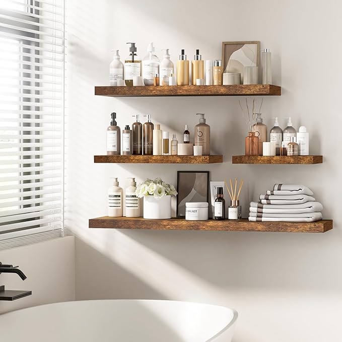 - Versatile & Multi-Scene Functionality: Our floating shelves are available in a variety of sizes and thicknesses, allowing you to choose the perfect fit for your space. Use them in the bathroom to store beauty products, hair care items. In the bedroom, they can hold books, cosmetics, and personal items. In the kitchen, theyâre perfect for spices, jars, or small utensils. Or display photo frames, trophies, or collections in the living room. These shelves efficiently use wall space to create a tidier, more spacious feel in any room.