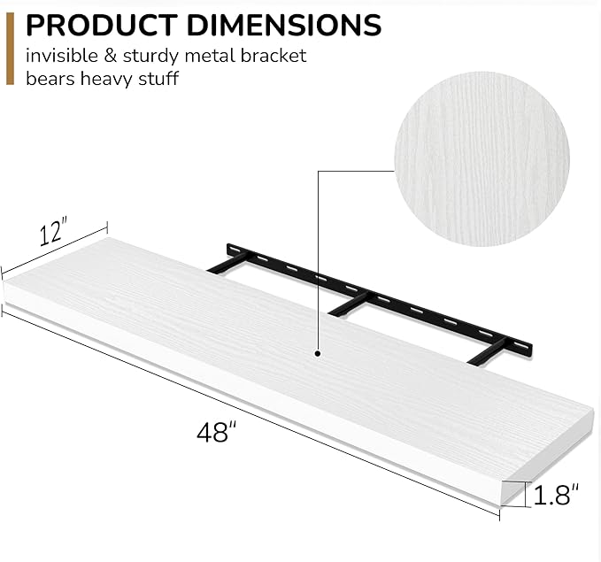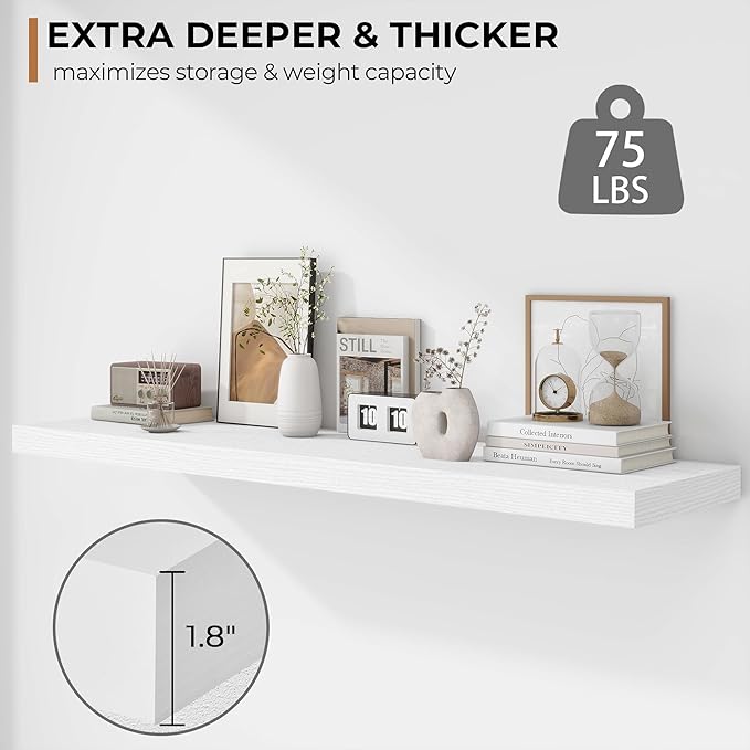 - Extra Deeper & Thicker - Each board measures 48"W x 12"D x 1.8"H. Extra deeper and thicker design in order to bring maximizes storage space and weight capacity, even hold up to 75 lb each. This floating shelf taking up zero square feet, reduces clutter and highlights dÃĐcor in compact spaces.