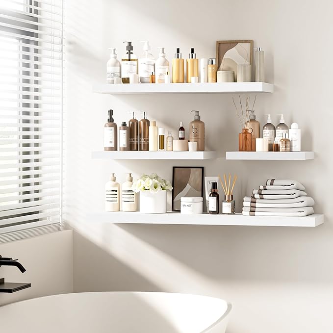 - Versatile & Multi-Scene Functionality: Our floating shelves are available in a variety of sizes and thicknesses, allowing you to choose the perfect fit for your space. Use them in the bathroom to store beauty products, hair care items. In the bedroom, they can hold books, cosmetics, and personal items. In the kitchen, theyâre perfect for spices, jars, or small utensils. Or display photo frames, trophies, or collections in the living room. These shelves efficiently use wall space to create a tidier, more spacious feel in any room.