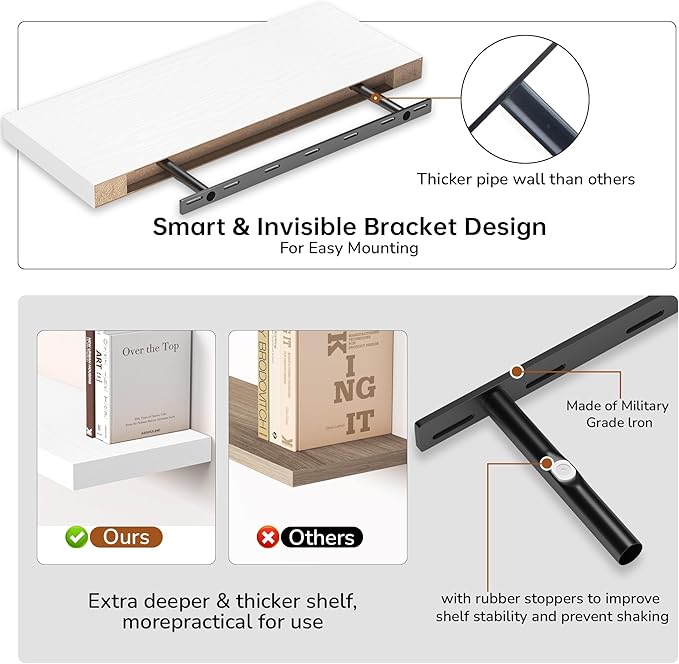 - Extra Deeper & Thicker - Each board measures 24"W x 8"D x 1.5"H. Extra deeper and thicker design in order to bring maximizes storage space and weight capacity, even hold up to 50 lb each. This floating shelf taking up zero square feet, reduces clutter and highlights dÃĐcor in compact spaces.