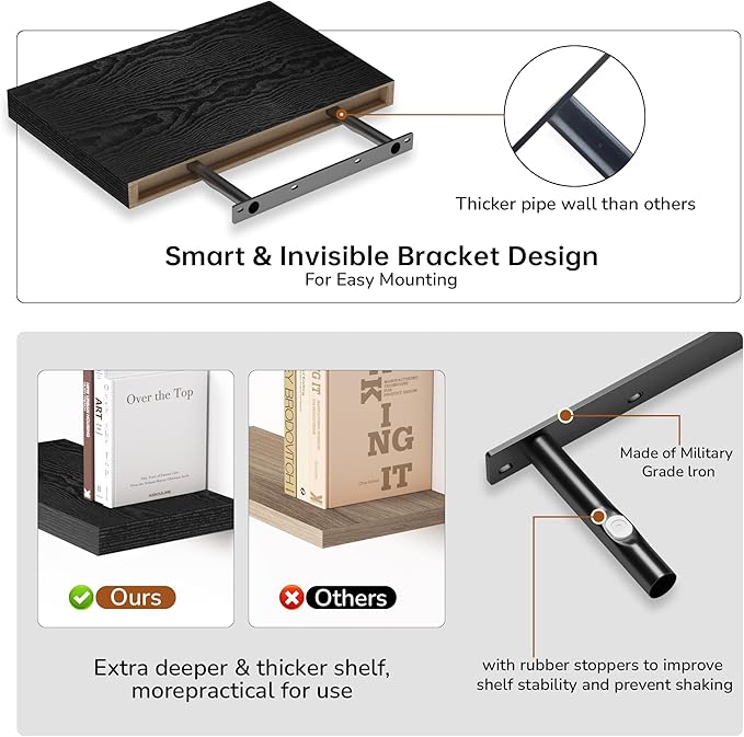 - Extra Deeper & Thicker - Each board measures 16"W x 12"D x 1.5"H. Extra deeper and thicker design in order to bring maximizes storage space and weight capacity, even hold up to 30 lb each. This floating shelf taking up zero square feet, reduces clutter and highlights dÃĐcor in compact spaces.