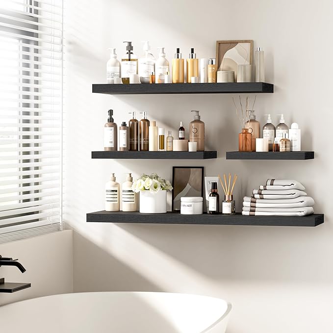 - Versatile & Multi-Scene Functionality: Our floating shelves are available in a variety of sizes and thicknesses, allowing you to choose the perfect fit for your space. Use them in the bathroom to store beauty products, hair care items. In the bedroom, they can hold books, cosmetics, and personal items. In the kitchen, theyâre perfect for spices, jars, or small utensils. Or display photo frames, trophies, or collections in the living room. These shelves efficiently use wall space to create a tidier, more spacious feel in any room.