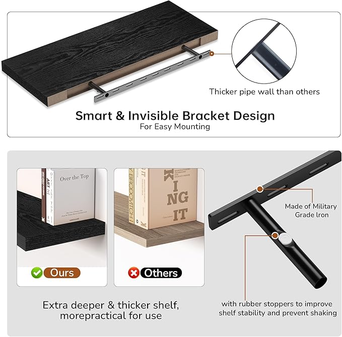 - Extra Deeper & Thicker - Each board measures 36"W x 12"D x 1.8"H. Extra deeper and thicker design in order to bring maximizes storage space and weight capacity, even hold up to 70 lb each. This floating shelf taking up zero square feet, reduces clutter and highlights dÃĐcor in compact spaces.