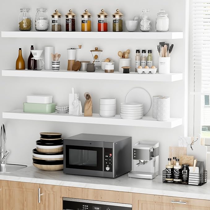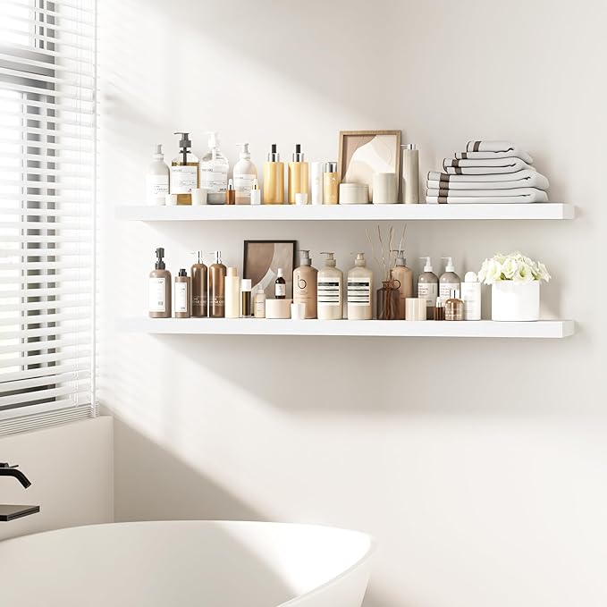 - Versatile & Multi-Scene Functionality: Our floating shelves are available in a variety of sizes and thicknesses, allowing you to choose the perfect fit for your space. Use them in the bathroom to store beauty products, hair care items. In the bedroom, they can hold books, cosmetics, and personal items. In the kitchen, theyâre perfect for spices, jars, or small utensils. Or display photo frames, trophies, or collections in the living room. These shelves efficiently use wall space to create a tidier, more spacious feel in any room.
