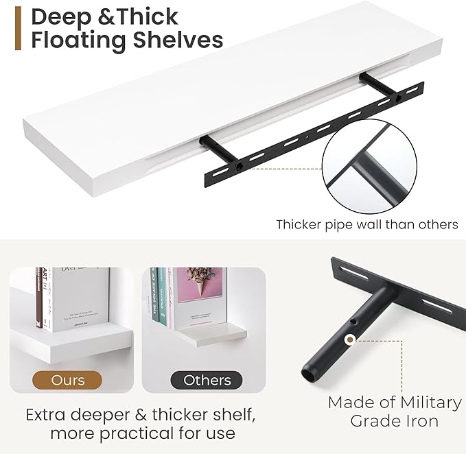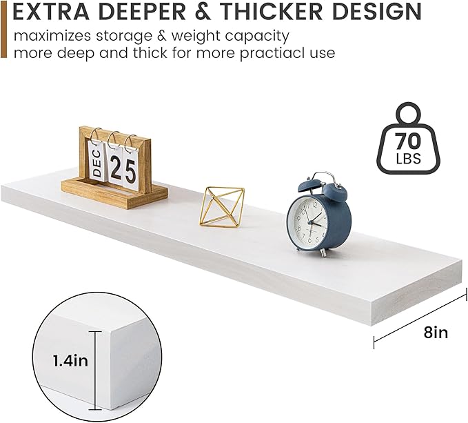 - Extra Deeper & Thicker for Storage - Each board measures 30"W x 8"D x 1.4"H. Extra deeper and thicker design in order to bring maximizes storage space and weight capacity, even hold up to 70 lb. This floating shelf taking up zero square feet, reduces clutter and highlights dÃĐcor in compact spaces. It can help make full use of the empty wall, making it much more space-saving and making your room look larger and tidier.