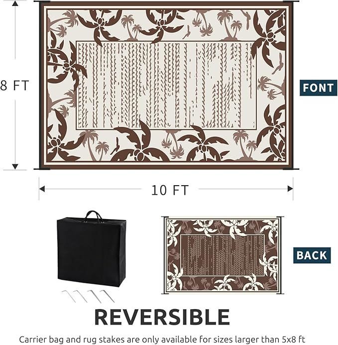 - Reversible Outdoor Rug: Featuring a double-sided tropical coconut tree design in a brown and beige palette, this indoor outdoor rugs bring a relaxing holiday vibe to your outdoor decor. and you can choose both sides to meet your needs, just flip the patio rug to switch patterns.