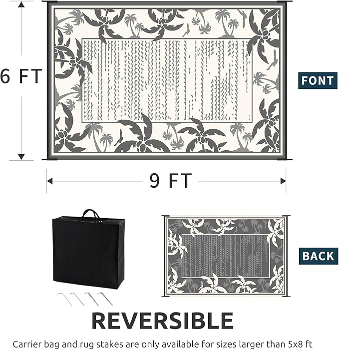 - Lightweight & Versatile: The outdoor plastic straw rug can be rolled or folded into a compact size and comes with a handy carrying bag for easy transportation. Itâs perfect for outings, picnics, sunbathing, and RV road trips. Note: The outdoor rug 5x8 ft size does not include a carrying bag or rug stakes.
