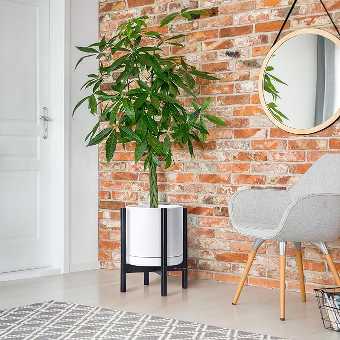 D'vine Dev Ceramic Planter with Ebony Stand - 12 Inch Modern Round Flower Pot with Wood Planter Holder, White, 55-B-H-1