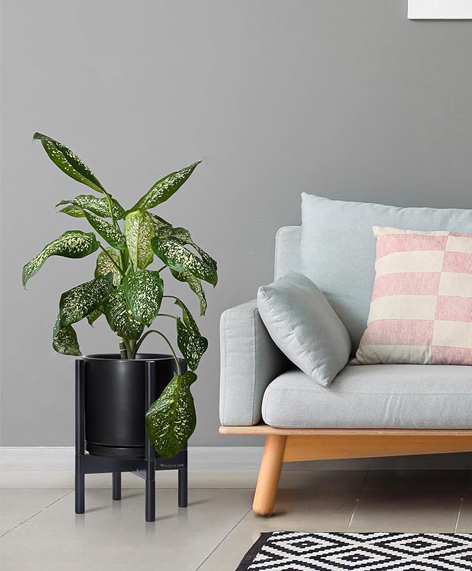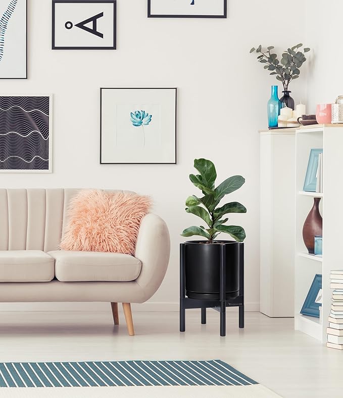 D'vine Dev Ceramic Planter with Ebony Stand - 10 Inch Modern Round Flower Pot with Wood Planter Holder, Black, 55-B-L-2