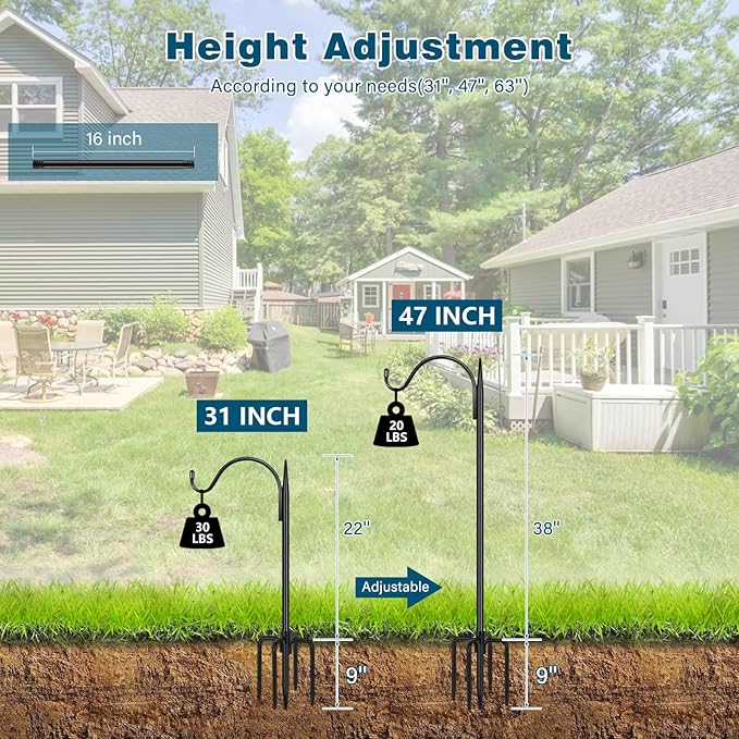- Adjustable Height: The small shepherds hooks are available in 2 sizes, 47 in and 63 in, suitable for different garden space layout needs. Specifically, the 47-inch model can be adjusted down to 31 inches by removing one 16-inch pole section, while the 63-inch model can be adjusted to 47 inches or 31 inches by removing 1 or 2 sections respectively