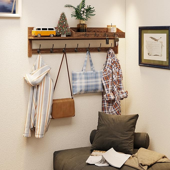AMBIRD Coat Rack Wall Mount, 35 inch Large Wall Hooks with Shelf, Entryway Shelf with 7 Dual Coat Hooks 4 Key Hooks Mail Organizer, Wooden Coat Hanger and Key Holder Wall Mount