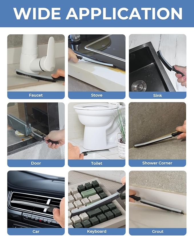 • Multi-purpose Brush: Our cleaning brush is suitable for cleaning various surfaces such as sinks, window tracks, blinds, door tracks, faucets, cars, stoves, grout lines, basins, floors, keyboards, bathtubs, vents, drains, swimming pools, vehicles, furniture, boats, countertops, microwaves, coffee machines, shower door frames, fans, shoes, sneakers, ovens, washing machines, toilet tank floors, the seam between the toilet bottom and toilet lid, the gaps in carved furniture, outdoor brick seams, etc.