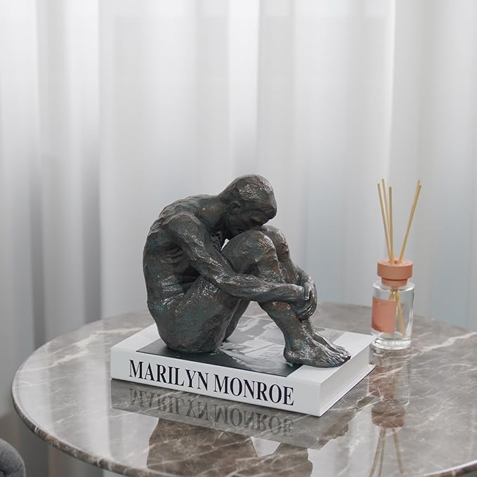 Guichifun Sitting Man Sculptures Home Decor - Resin Bronze Sitting Posture Holding Arms Legs Lonely Statues Decorative Objects Outdoor Gift for Men 9.25 x 5.25 x 7.5 Inch