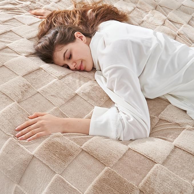 Cozy Bliss Checkered White Faux Rabbit Fur Throw Blanket, Soft Fuzzy Fluffy Minky Cream Furry Blankets for Couch, Bed (Tan, King(108" x 90")