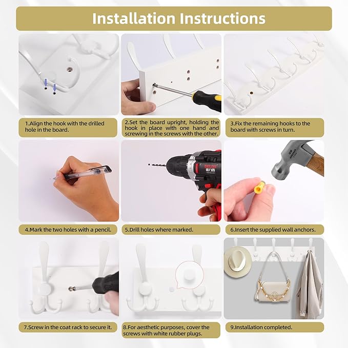 • [Package & Size]: PACKAGE: 2 x white pine plank, 10 x white triple-hooks, 20 x short screws, 4 x long screws, 4 x drywall anchors, 4 x white rubber plugs(the covers for the screws), 1 x installation instruction. SIZE: 16.9'' (L) x 4.7'' (W) x 2.8'' (Thick).