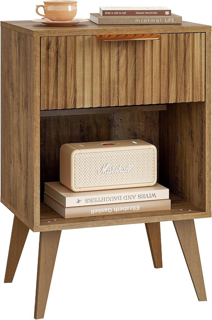 Fluted Night Stand with Opening Storage,Mid Century Bedside Table with Drawer,Wood Nightstand with Solid Wood Legs,End Table Side Table for Living Room,Bedroom,Caramel Oak CTG56BR