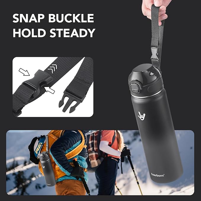Enerbone 24 oz Insulated Water Bottle, Stainless Steel Bottle with Carrying Strap, Double-Wall Vacuum Insulation Design, Leakproof Sports Bottle with Straw, Keep Drinks Cold or Hot for Hours