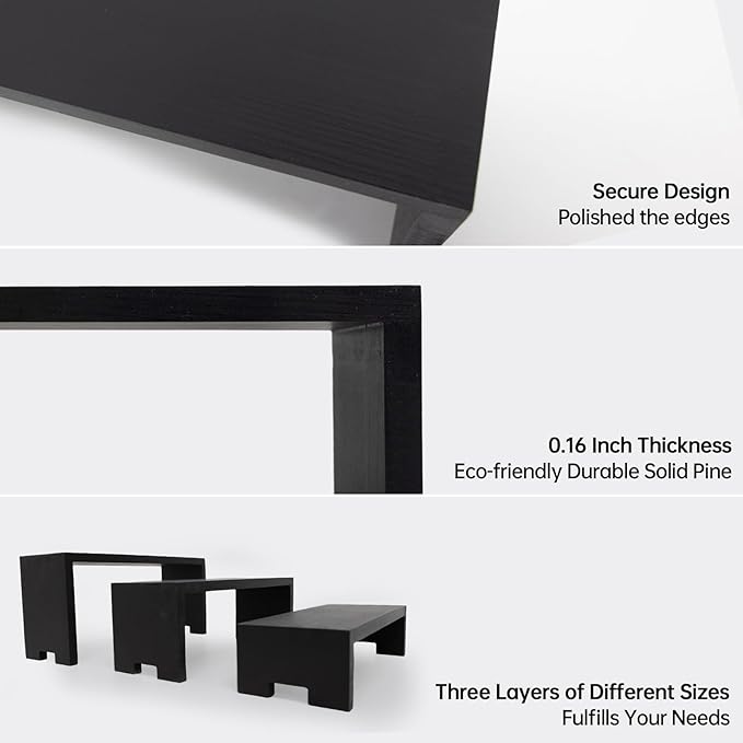 - ใTierd Display Stands for Vendorใ๐: First they are no need any tools then can be used directly! very convenient to display more items for vendors, they are not only beatiful but also improve space utilization rate, U-shaped wood risers, fire-carbonized, durable, non-toxic, odorless, and no deformation, nested design for easy storage in living room,bedroom,kitchen,indoor,outdoor, also can be used individually or as a set.