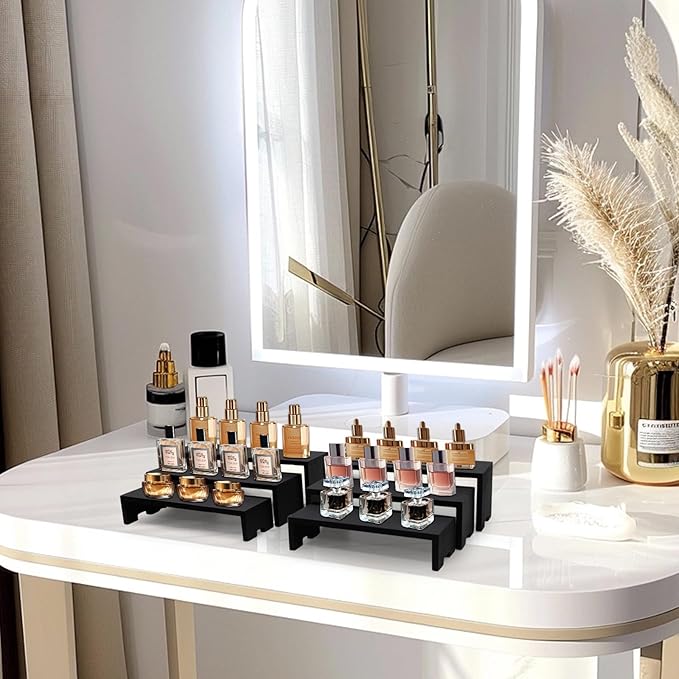 - ใWooden Tierd Risers for Displayใ๐: This 2 set 3 tier small display shelf for cupcakes or vendors has stackable nesting design, so the wooden display risers easily access as desktop storage racks,also they has strong load-bearing capacity for more kinds perfumes, collectible figures,kitchen condiment bottles, bathroom toiletries because of varieties size of (L7.8''/20cm-8.6''/22cm-9.4''/24cm)XW2.9'' /7.3cm