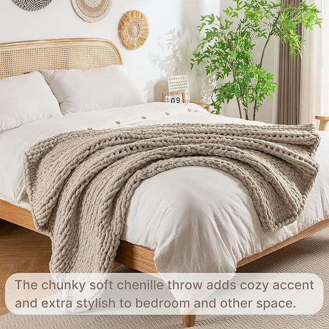 Chunky Knit Blanket Throw, 100% Hand Knit Throw Blanket Handmade Chenille Cable Knit Throw for Couch, Stylish Cozy Soft Rope Knot Crochet Blanket for Home Decor, Beige Linen, 50x60 Inches