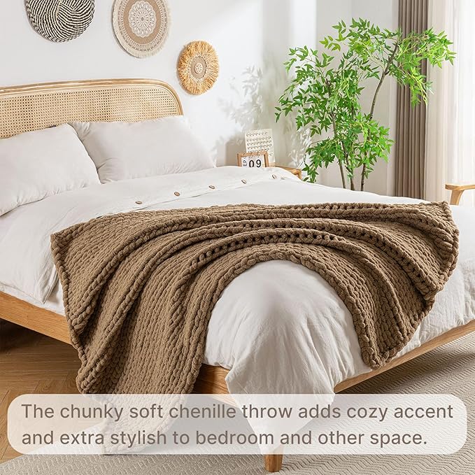 Chunky Knit Blanket Throw, 100% Hand Knit Throw Blanket Handmade Chenille Cable Knit Throw for Couch, Stylish Cozy Soft Rope Knot Crochet Blanket for Home Decor, Camel, 50x60 Inches