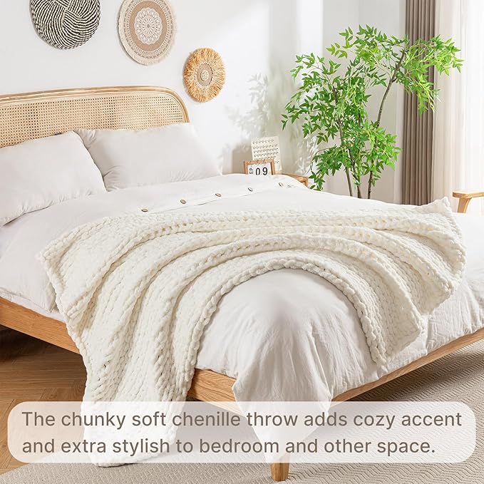 Chunky Knit Blanket Throw, 100% Hand Knit Throw Blanket Handmade Chenille Cable Knit Throw for Couch, Stylish Cozy Soft Rope Knot Crochet Blanket for Home Decor, Ivory, 50x60 Inches