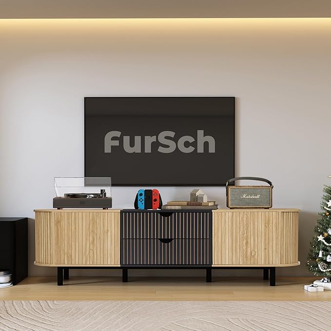 - Elegant Fluted Design: This TV stand showcases a captivating slatted roller shutter sliding door design, perfectly paired with a sleek curved profile. The elegant tambour doors not only enhance the aesthetic appeal but also allow for seamless access to your media devices while adding a modern touch to any living space.