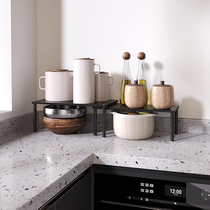 • 【Flexible Combination, Space Optimization】With their unique design, with one slightly smaller than the other, these shelf organizers can be stacked on top of one another, nested, used separately, or even in an L-shape.It is a flexible storage solution that transforms your kitchen into a more organised and tidy space.