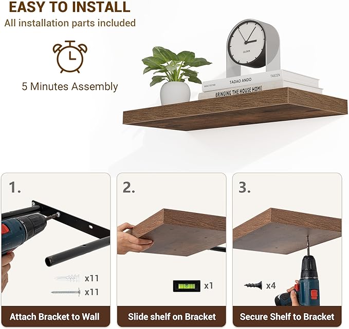 - 【Easy Installation】Designed with user convenience in mind, these shelves come with all necessary mounting hardware and clear instructions. You can have them up and ready to use in less than 5 minutes. Plus, our customer service is always ready to assist with any queries or concerns, ensuring a hassle-free experience