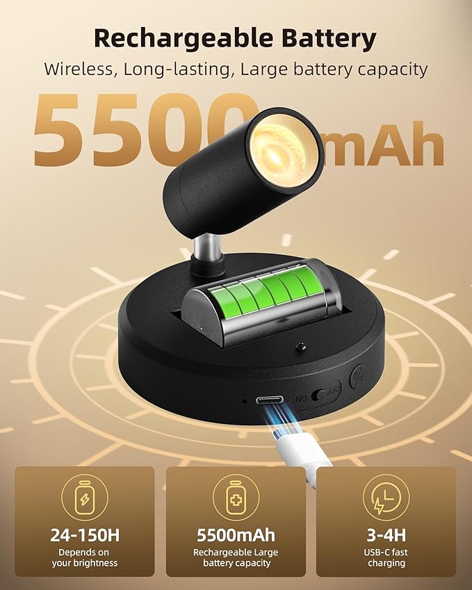 - 5500mAh Rechargeable Spotlight: The EZVALO plant spotlight indoor features a powerful 5500mAh rechargeable battery, Provide up to 150 hours of low brightness and 24-25 hours of high brightness lighting.Using the equipped USB-C fast charging, Battery operated spot light can be fully charged within 4 hours, providing cordless, long-lasting 100 lumens glare-free lighting,Very suitable for indoor plant lighting and picture lighting