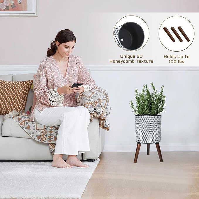 • 【Why Choose A Flower Pot With A Stand? 】This standing plant pot features a 3D honeycomb texture on its surface, seamlessly integrating the natural beehive structure into interior decor. The raised wooden legs raise the flower pot, creating an elegant and orderly atmosphere in the room.