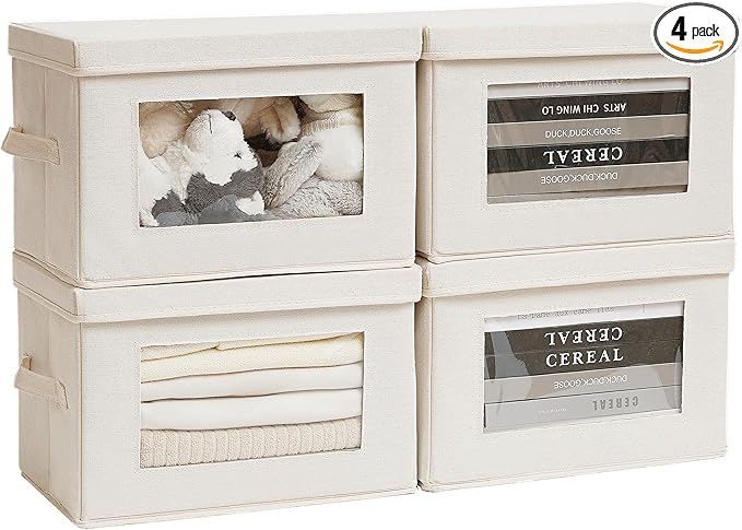 Citylife 4-Pack Storage Bins with Lids, Fabric Foldable Storage Bins with Soft Cord Handles, Cube Closet Storage Baskets with Lids, Organizers for Organizing Clothes and Books, Beige