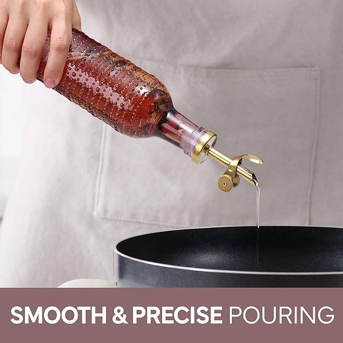 • Beautiful and Functional - Our colored glass oil dispensing bottles, with elegeant colors, gold tops and gold wire rack, will elevate your kitchen. Don't use just any oil bottle, upgrade the way you cook. That's our mission.