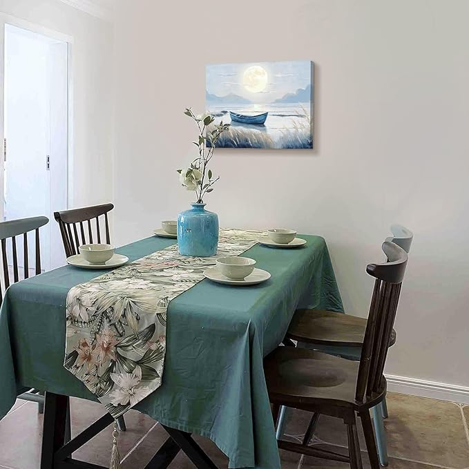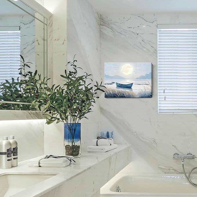 - Tranquil Wall Art for Every Space. Transform your walls with this stunning coastal canvas wall art featuring a peaceful moonlit lake, glowing moon, and a serene boat. Perfect for adding nature-inspired elegance to your bathroom, kitchen, bedroom, or office dΓ©cor
