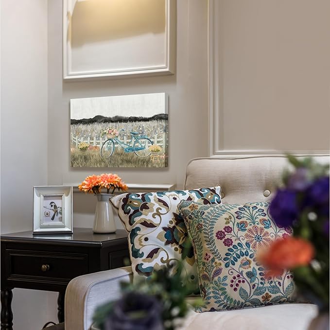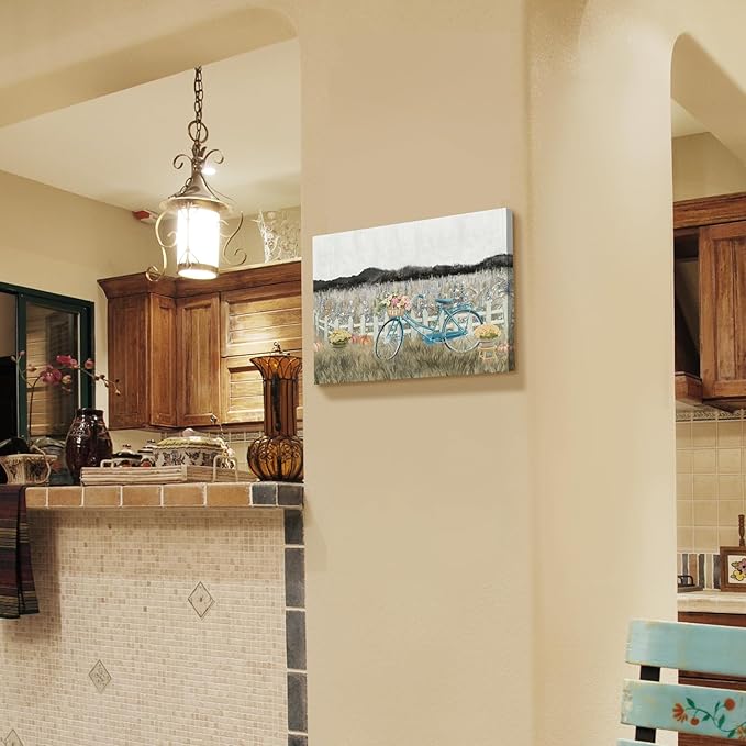 - Versatile Modern Farmhouse Wall Decor. This canvas wall art blends modern farmhouse style with vintage charm, featuring a blue bicycle, floral basket, pumpkins, and a rustic picket fence. With soft beige, taupe, and warm brown tones, it adds warmth and character to bedrooms, bathrooms, kitchens, and moreโperfect for those who love neutral, earthy decor.