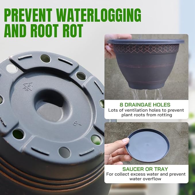 • Drainage Hole and Saucer - There are 8 drainage holes at the bottom of our garden pots, which can control excess water, increase the breath ability and benefit the growth of plants; the lightweight saucer can not only collect excess water,but also keep your floor or desktop clean.