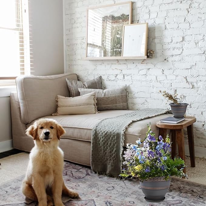 • Drainage Hole and Saucer - There are 8 drainage holes at the bottom of our garden pots, which can control excess water, increase the breath ability and benefit the growth of plants; the lightweight saucer can not only collect excess water,but also keep your floor or desktop clean.