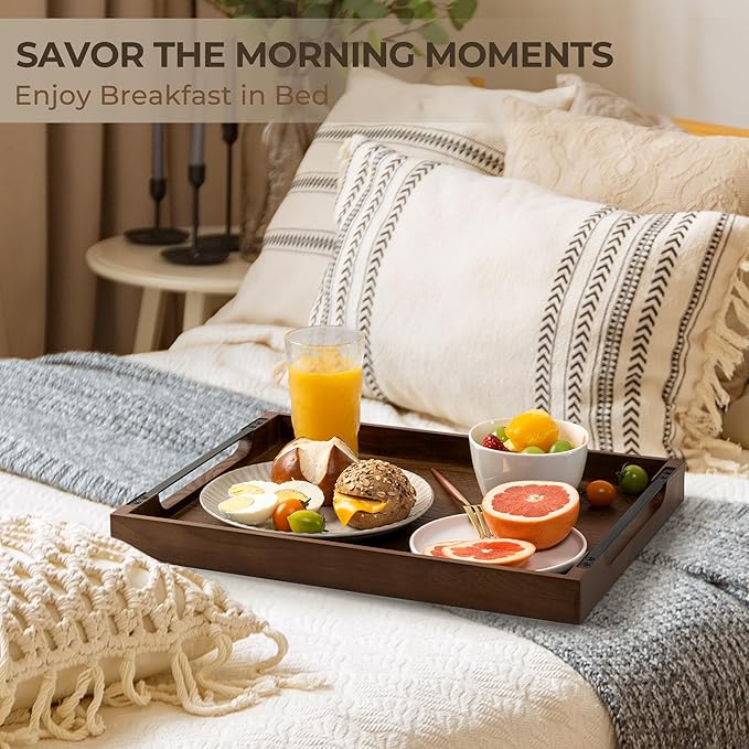 - Versatile Functionality: Measuring 17x13x1.6 inches, this elegant walnut serving tray has the perfect size to fit your favorite foods and yet is lightweight enough for easy carrying when the bed serving tray is full. Ideal for use as coffee tray, bandeja de madera para decoraciÃģn, table trays decorative, fits perfectly with home decor themes, breakfast trays for bed, tray for couch, wooden ottoman tray, cocktail tray, coffee table tray & wood food tray
