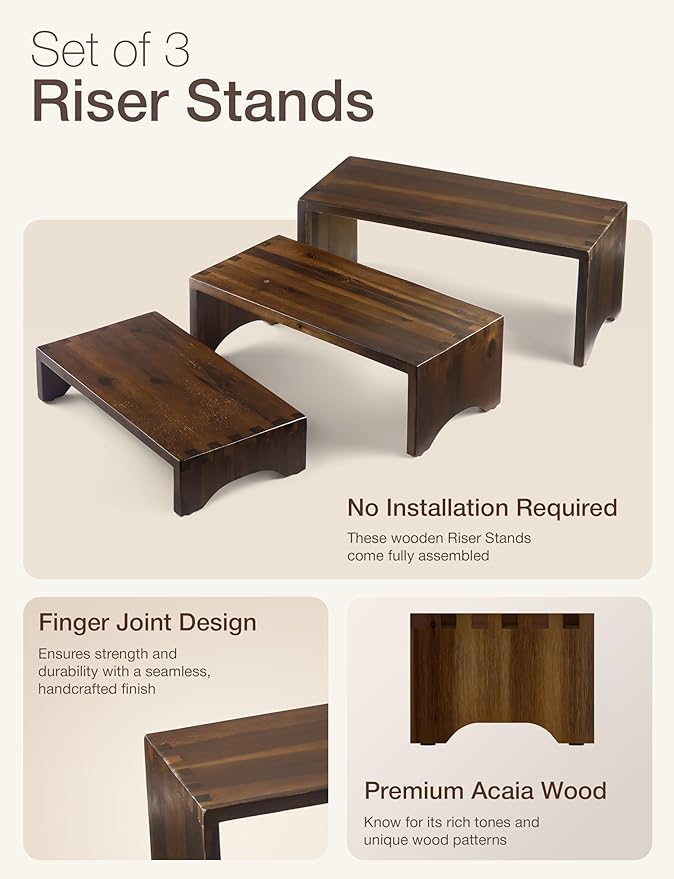 - Space-Saving Solution: Create more space for your favorites food with this versatile table risers for display, and tuck it away neatly when not in use. This wood display riser set serves beautifully as food stands for display party or wooden risers for table display at home, weddings, or small business events