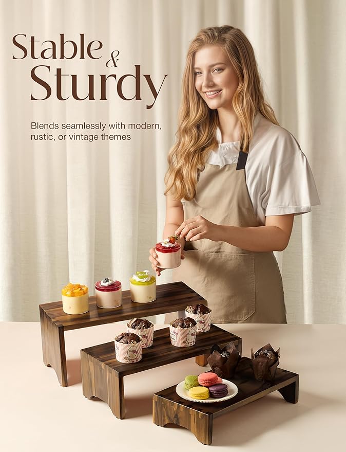 - Multi-Purpose Design: Use it as a wooden 3 tier cupcake stand, wood cupcake stand, or wooden stands for cheese, desserts, charcuterie, or plant displays at events and gatherings. Beside displaying as wooden cupcake stand, organize your spices, miniatures or decorative items in a more stylish way