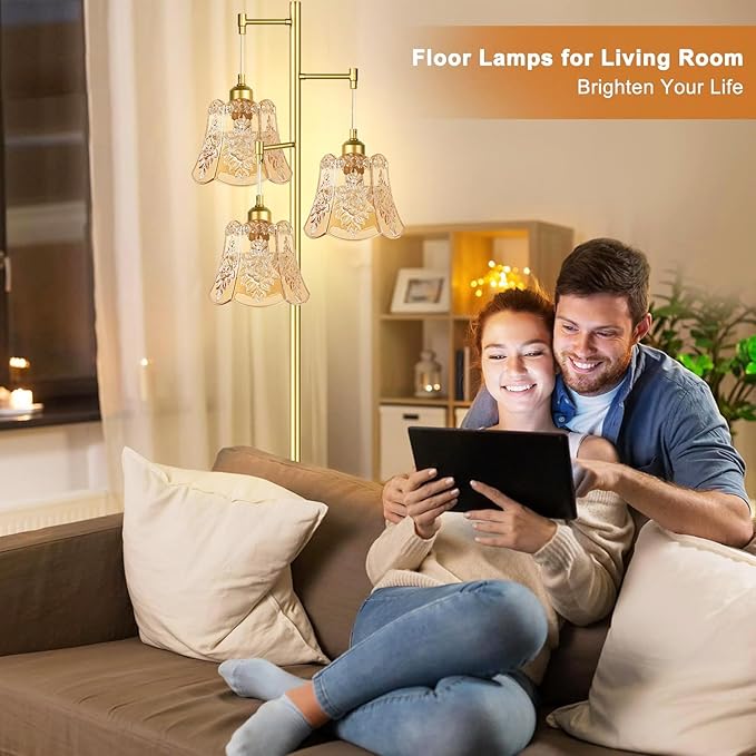 Gold Floor Lamp for Living Room,Bedroom,Tree 3 Light Standing Lamp Mid Century Modern Brass Tall Floor Lamps Vintage Retro Floor Lights Glass Green Flower Lamp Shade Farmhouse Boho Bohemian