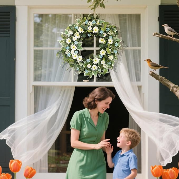 - 1. Lifelike Beauty: Crafted with high-quality silk, this wreath features vibrant white and blue daisies that look incredibly realistic. The delicate petals and rich colors bring a touch of natureโs charm to your home, making it perfect for spring, summer, fall, Christmas or year-round decorating