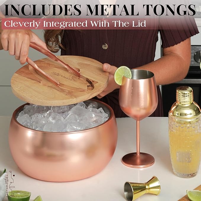 • QUALITY THAT MATTERS Stainless steel large insulated ice bucket with wooden lid and tong crafted for durability and optimal insulation, BPA-free ice bucket for bar with comfortable and ergonomic design that makes it perfect for parties and gatherings